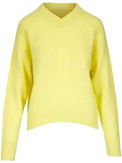 yellow V-neck drop shoulder ribbed cuffs and hem curved hem