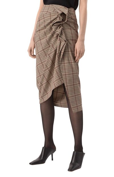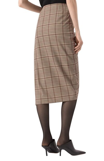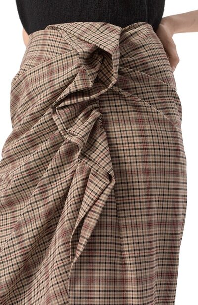 Асимметричная миди-юбка в виндзорскую клетку сшита из ткани стрейч на основе полиэстера и вискозы. Модель с объемной драпировкой застегивается потайной молнией сбоку.