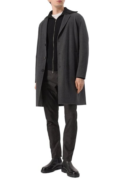 Пальто без подклада сшили из меланжевого кашемира с добавлением эластана. Модель со слегка спущенной линией плеч, внутренним карманом и двумя внешними застегивается пуговицами.