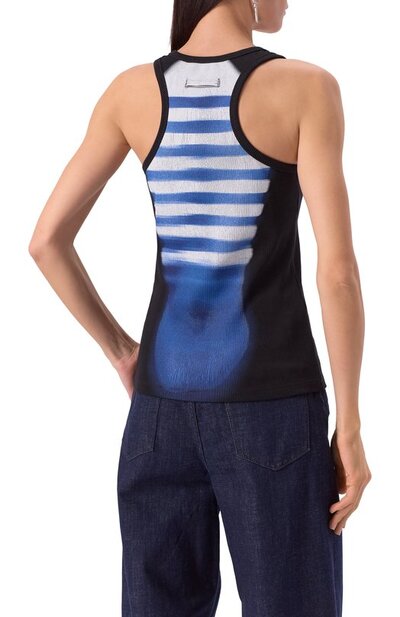 Майку из ребристого хлопкового трикотажа стрейч украсили принтом Le Male, напоминающим очертания флакона фирменного аромата. Бретели дополнили брендированными пряжками, а спинку — нашивкой.