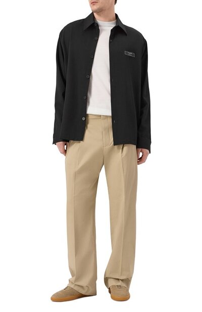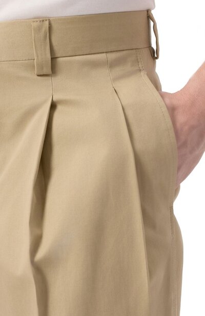 Брюки Double Pence кроя Loose fit сшили из хлопкового твила. Модель со стрелками и парными складками спереди дополнили боковыми карманами и задними с клапанами на пуговицах.