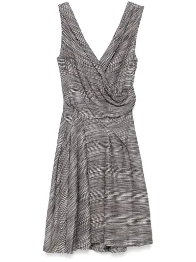 circa 2010s black cotton blend horizontal stripe pattern concealed side hook and zip fastening V-neck V-back sleeveless draped design pleat detailing full lining flared hem Condition: EXCELLENT. This previously owned item is in near-perfect condition with no signs of damage or use.
