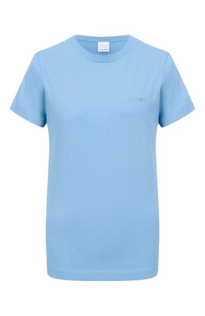 Футболку с рифленой отделкой на круглой горловине сшили из хлопкового джерси. Спереди модель украсили логотипом марки, вышитым шелковистой нитью в тон.