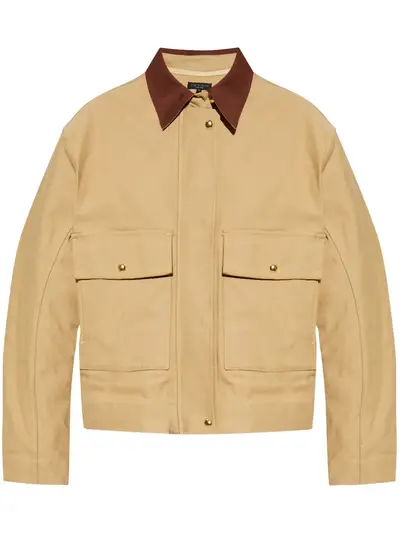 sand beige front press-stud and zip fastening two front flap pockets contrasting collar straight hem