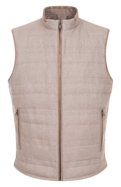 Жилет, утепленный гусиным пухом, можно носить наружу фактурной стороной из смеси шерсти и шелка или гладкой из полиэстера. Контуры молнии, боковых карманов, проймы и воротника-стойки отделаны экозамшей.
