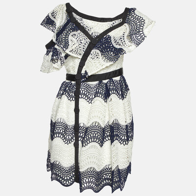 Delicate yet structured, this Self Portrait mini dress features intricate wavy guipure lace in a deep navy blue. The fitted silhouette and sheer lace detailing create an elegant yet modern aesthetic. A perfect choice for evening events, it blends femininity with contemporary charm