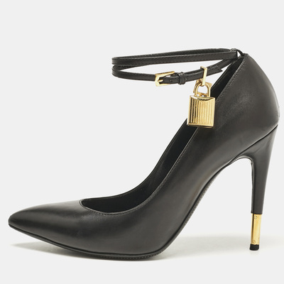 Exuding power and sophistication, these Tom Ford pumps feature sleek black leather with an alluring ankle wrap design. The signature gold tone padlock charm adds a touch of edgy luxury, while the pointed toe and stiletto heel create an ultra chic silhouette. Perfect for those who appreciate bold, statement footwear.