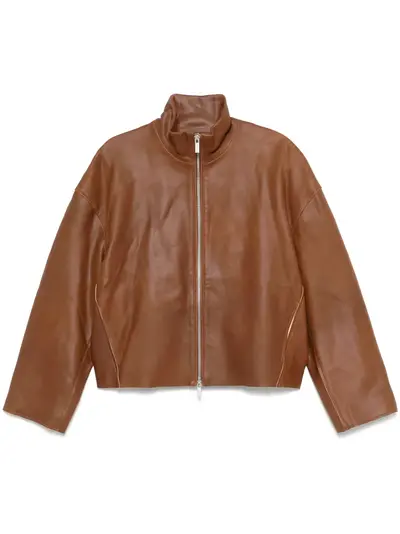 cognac brown front two-way zip fastening slip pockets to the sides drop shoulder stand-up collar
