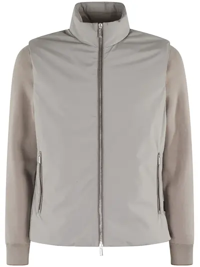 light grey front zip fastening two side zip-fastening pockets high neck long sleeves