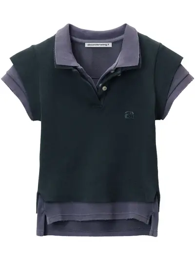 blue-grey polo collar embroidered logo at the chest layered effect distressed effect cropped