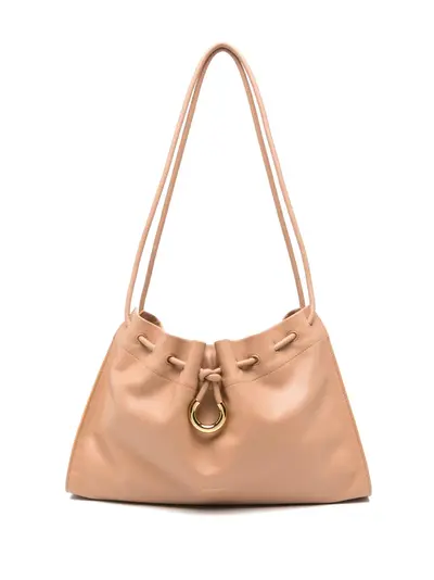 light brown concealed magnetic fastening drawstring fastening two flat shoulder straps This piece comes complete with a protective dust bag.