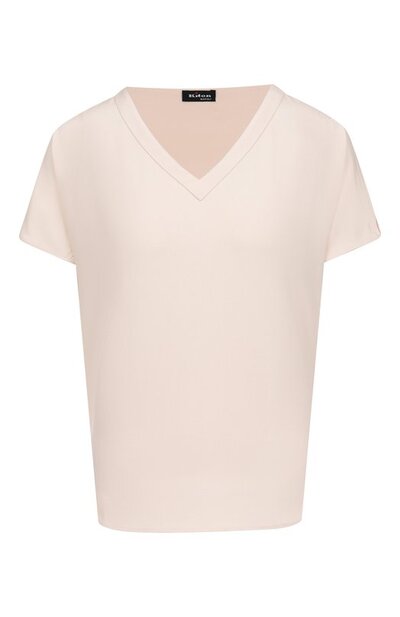 Топ с небольшими разрезами на рукавах и мягкой драпировкой под кокеткой на спинке сшили из эластичного шелка. Модель с V-образной горловиной составит идеальный дуэт с парными брюками.