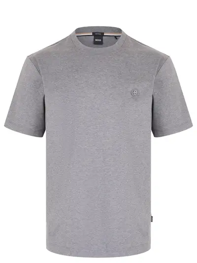 -Серая футболка из мягкого хлопка от BOSS BLACK. -Модель прямого кроя с короткими рукавами, круглым вырезом горловины и логотипом на груди. -Футболка станет базой как для спортивных образов, так и для повседневных аутфитов с джинсами, шортами или брюками.