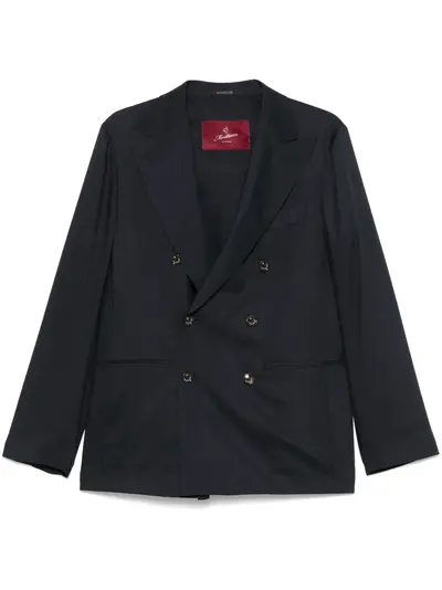 navy blue double-breasted button fastening chest welt pocket two front jetted pockets English rear vents