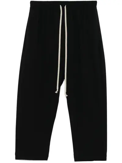 black elasticated drawstring waistband two side slit pockets two rear flap pockets pressed crease
