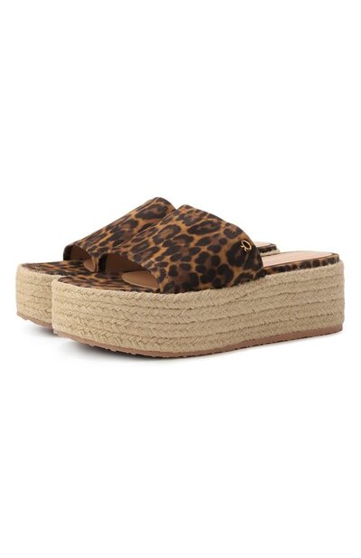 Сабо на массивной подошве, оплетенной джутом, изготовили из замши с леопардовым мотивом. Модель с логотипом на стельке украсили металлической деталью Ribbon на широкой перемычке.