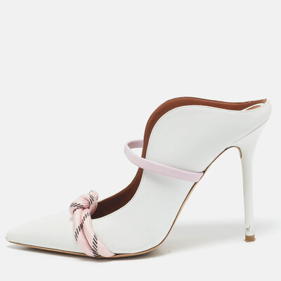 Malone Souliers Maureen mules are a cult favorite—the distinctive sculpted silhouette with dual bands is instantly recognizable. In white leather, this pointed toe pair looks luxe when worn for the day or night. Show the shoes off with cropped hemlines.