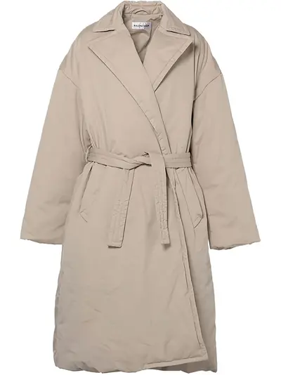 circa 2019 sesame beige cotton padded design belted waist notched collar drop shoulder long sleeves two side welt pockets mid-length Condition: GOOD. This previously owned and used item is in good condition with minimal signs of use. This may include fading of material or plating and scratches.