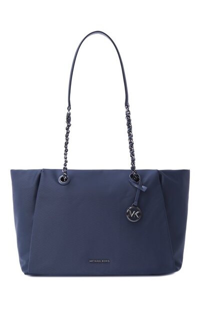 Сумку Georgia из гладкого текстиля украсили рельефным логотипом марки. В цепочки на комбинированных ручках вплели узкие ремешки в тон. Аксессуар с внутренним карманом застегивается молнией. В комплекте – съемный брелок с монограммой MK.