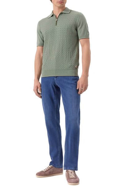 Слегка выбеленные джинсы с эластичными вставками на поясе по бокам украсили фирменным жакроном, заклепкой на самом маленьком из пяти карманов и вышитыми монограммами на задних. Брюки из стрейчевого денима с добавлением лиоцелла и модала застегиваются потайной молнией и пуговицей в виде фирменного октагона.