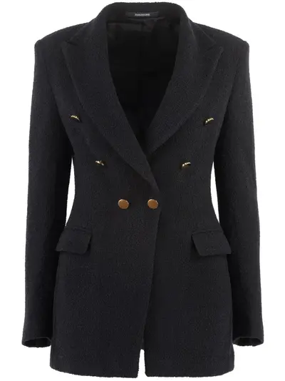 black double-breasted button fastening two side flap pockets central rear vent notched lapels