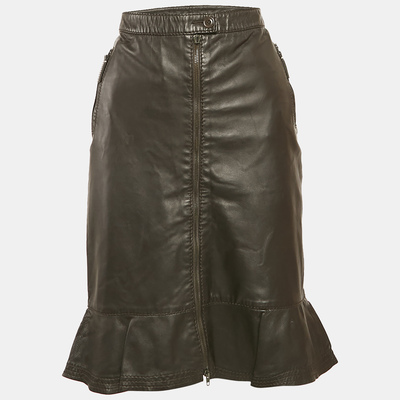 Moschinos skirt comes in brown leather with a front zipper and two pockets. The flounce hem keeps things playful, making it a fun pick for day or night.
