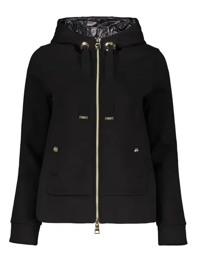 black front two-way zip fastening drawstring hood two press-stud fastening side pockets logo plaque