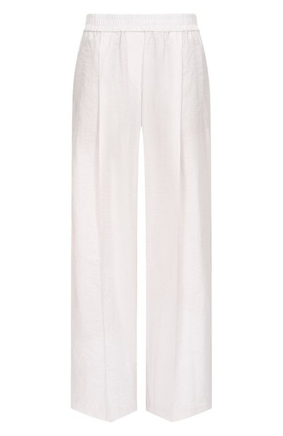 Брюки с эластичным поясом и имитацией ширинки сшиты из жатого твила на основе хлопка и полиамида. Модель с небольшими защипами и отутюженными стрелками дополнили боковыми и задними карманами.