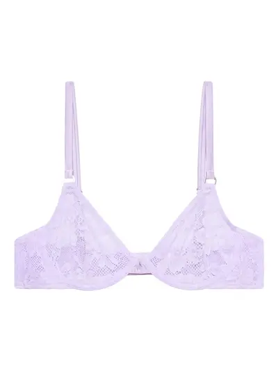 light purple lace design sheer look adjustable shoulder straps hook-and-eye fastening scalloped edges underwire support
