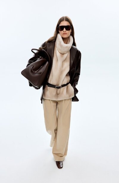 Ремень из гладкой кожи застегивается прямоугольной металлической пряжкой с закругленными углами. Аксессуар дополнили съемным кошельком с треугольным клапаном.