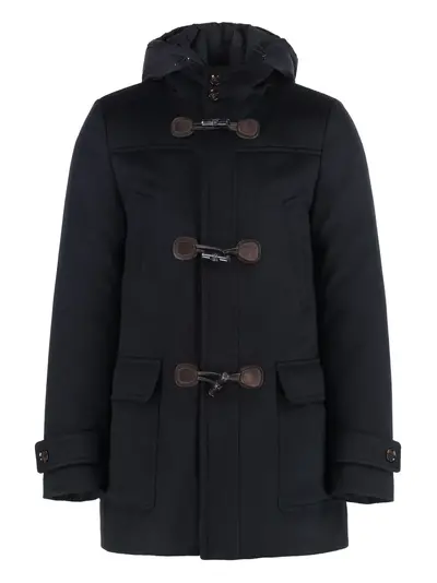 navy blue front toggle fastening chest welt pocket two front flap pockets belted cuffs