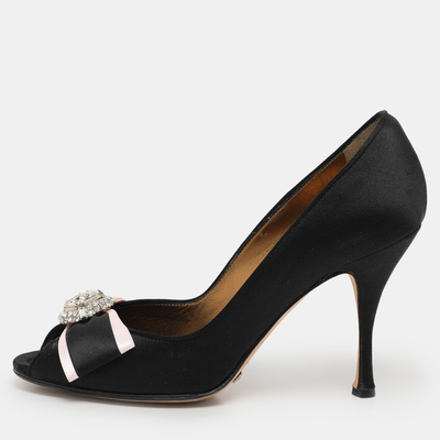 The Dolce and Gabbana pumps are a statement of luxury and elegance. Crafted from smooth black satin, these pumps feature a stunning crystal encrusted bow on the toe, adding a touch of glamour and sophistication. Perfect for evening events or special occasions, they combine opulence with timeless design.
