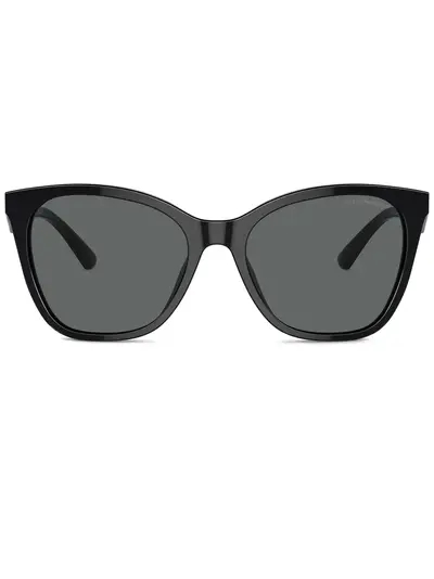 black acetate glossy finish cat-eye frame grey tinted lenses logo plaque at the arm straight arms curved tips These glasses come with a protective case.