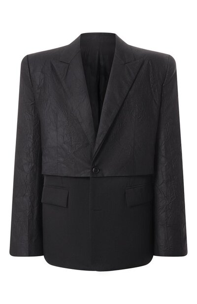 Oversize-пиджак с акцентированной линией плеч сшили из хлопка, а укороченный верхний слой и подкладку выполнили из жатой ткани. Модель со шлицей сзади дополнили двумя боковыми карманами.