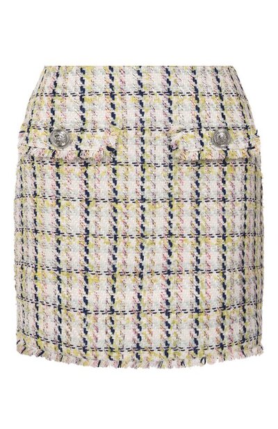 Юбку с цельнокроеным поясом и потайной молнией сбоку сшили из букле на основе полиэстера. Модель с короткой бахромой внизу и на декоративных клапанах с фирменными пуговицами украсили металлической накладкой с литерами LJ сзади.