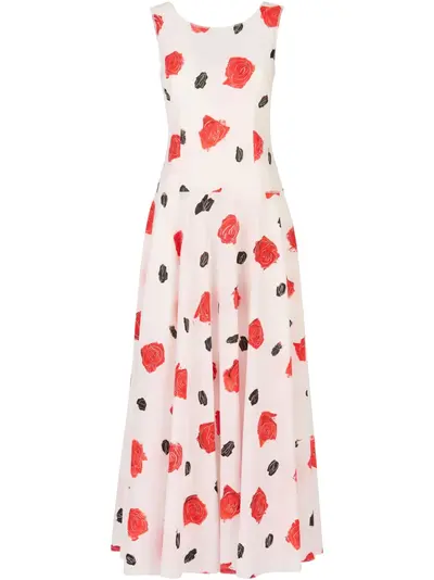 white rear zip fastening floral design red roses black accents sleeveless flared silhouette fitted bodice round neckline concealed side pockets