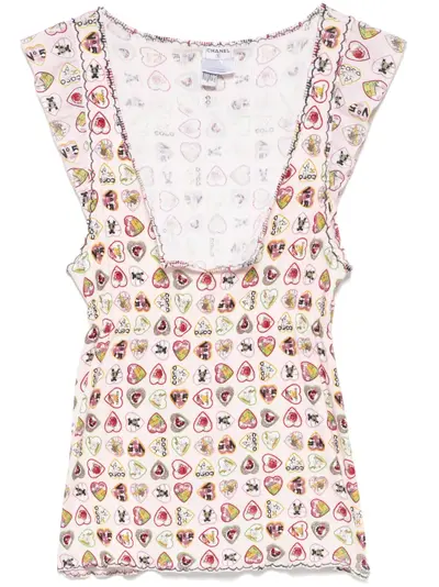 circa 2006 pink/multicolor fine ribbed stretch-jersey keyhole neck all-over graphic print sleeveless ruffle cuffs elasticated hem Condition: GOOD. This previously owned and used item is in good condition with minimal signs of use. This may include fading of material or plating and scratches.