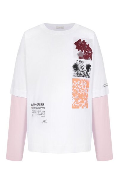 Oversize-модель напоминает принтованную футболку, надетую поверх однотонного лонгслива. Изделие из хлопкового трикотажа может стать основой непринужденного повседневного образа, например, с шортами и кедами.