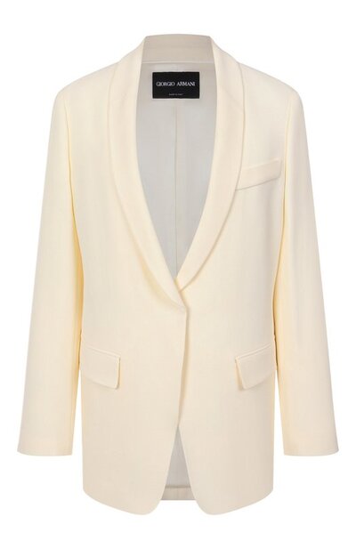 Однобортный жакет с разрезами на манжетах и двумя шлицами сзади сшили из шелкового кади. Модель с узким шалевым воротником дополнили нагрудным и парой боковых карманов с клапанами.