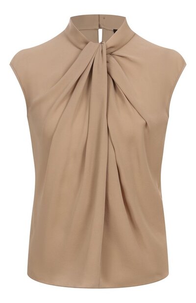 Для пошива блузы без рукавов использовали жатый жоржет из шелка малберри. Модель с пуговицами на воротнике-стойке сзади декорировали спереди драпировкой, напоминающей узел.