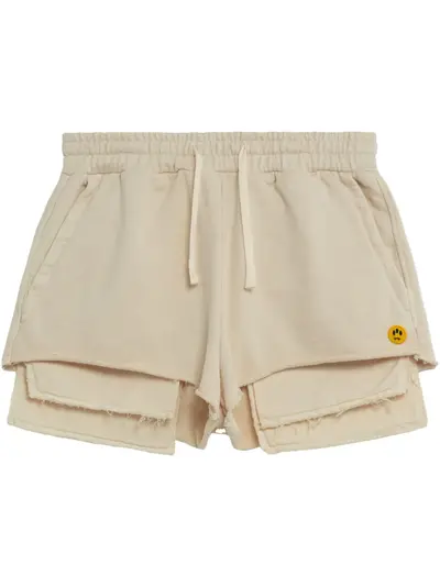 beige elasticated drawstring waistband two side slit pockets two rear welt pockets layered design