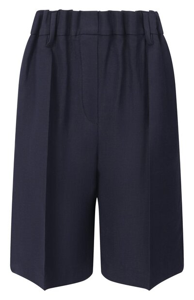 Бермуды с боковыми и задними карманами сшили из вискозного твила Fluid с добавлением льна. Шорты с эластичным поясом-кулиской дополнили имитацией ширинки и защипами, переходящими в отутюженные стрелки.