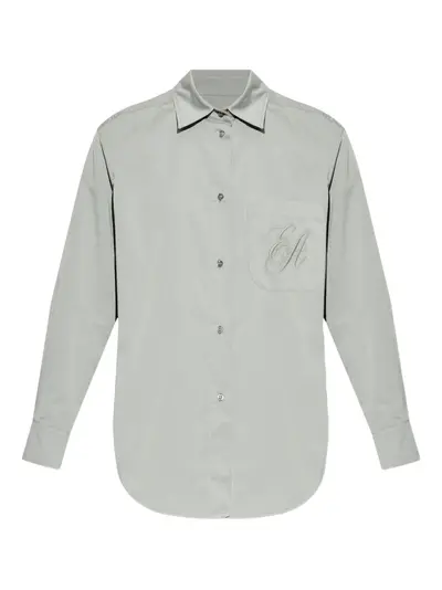 taupe grey front button fastening classic collar chest flap pocket embroidered logo at the chest