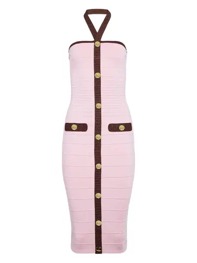 light pink rear zip closure halter neck ribbed detail front button closure contrasting trim side pockets