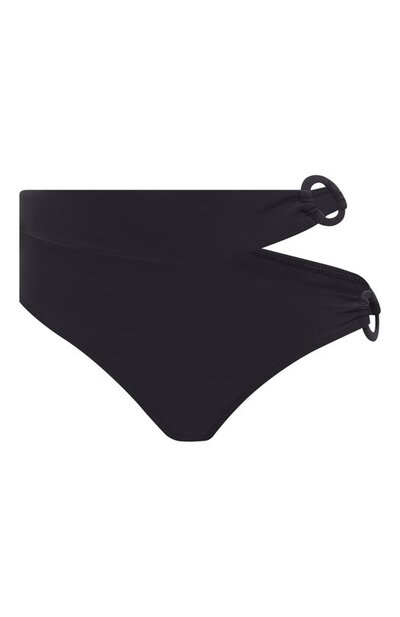 Плавки Summer Essence с высокой посадкой сшили из быстросохнущего эластичного материала на основе переработанного полиамида. Сбоку модель украсили вырезом и крупными кольцами на перемычках, а сзади – миниатюрной брендированной пластиной.