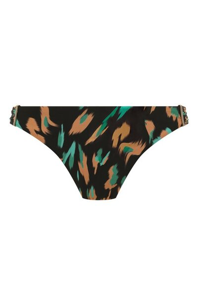 Плавки-бикини из линии Feline Energy сшиты из нейлонового джерси с абстрактным принтом. Модель украшена золотистыми вставками по бокам и брендированной пластиной сзади.