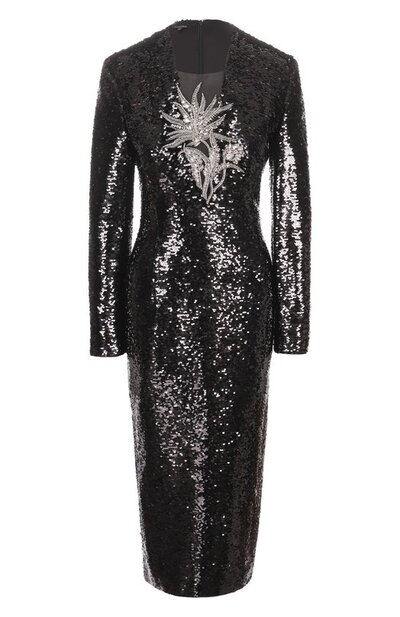 Приталенное миди-платье с потайной молнией на спинке и разрезом на подоле сзади выполнили из хлопка, полностью покрытого пайетками. Глубокое декольте с отделкой из полупрозрачного тюля телесного оттенка украсили цветком из кристаллов и бисера.