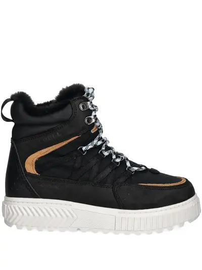 black front lace-up fastening waterproof pull-tab at the heel rubber tread sole