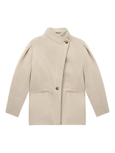 light beige front button fastening two front welt pockets mock neck long sleeves