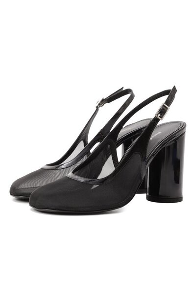 Туфли Ginevra с отделкой из гладкой лакированной кожи выполнили из полупрозрачной сетки. Модель с круглым мысом, на высоком цилиндрическом каблуке застегивается на открытом заднике ремешком с пряжкой.